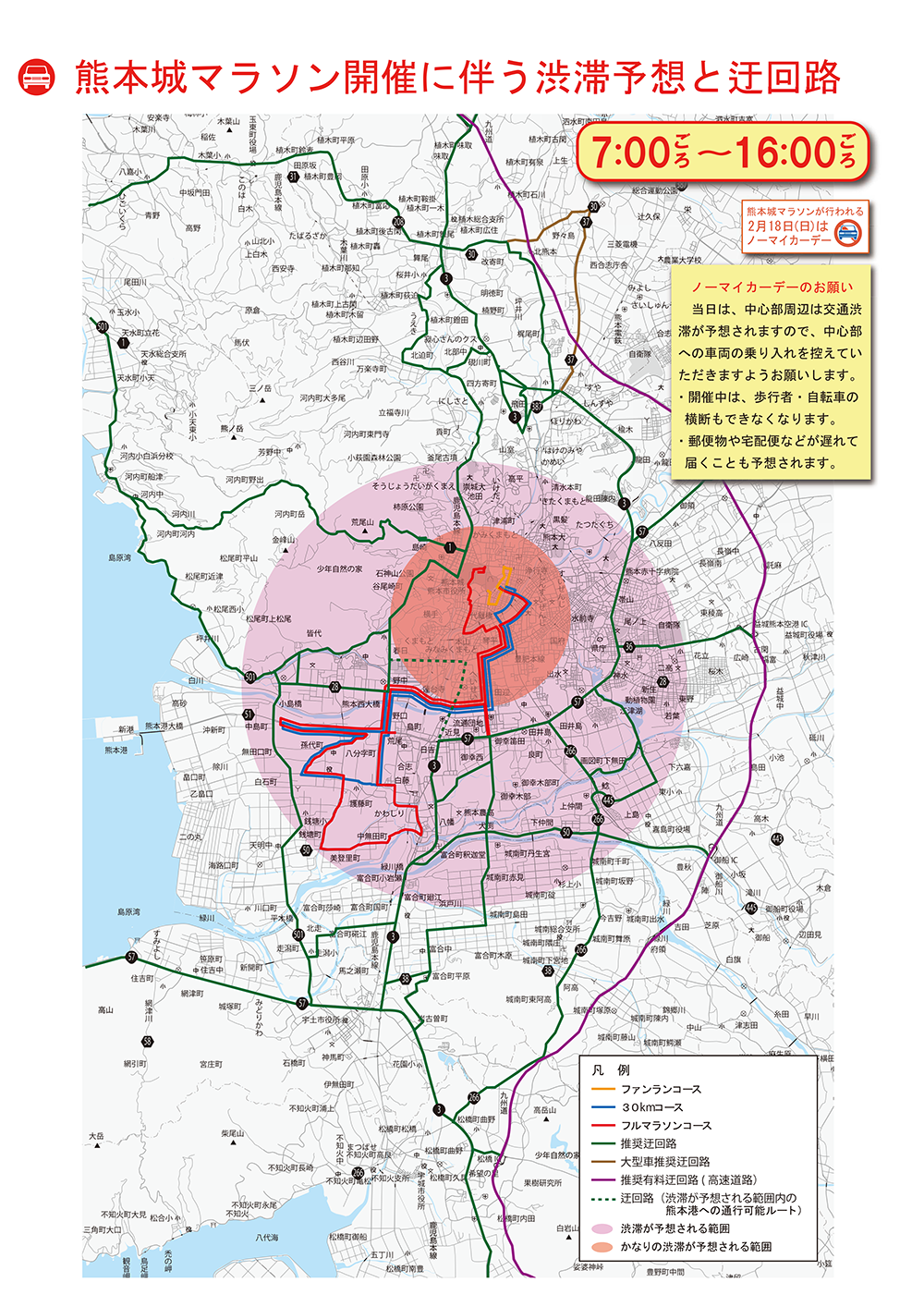 大会当日は、長時間にわたり大規模な交通規制を行いますので、コース沿線以外の通行可能な道路でもかなりの渋滞が予想されます。沿道にお住まいの皆様をはじめ、各店舗、営業所などの関係者の皆様には、大変ご迷惑をおかけいたしますが、熊本城マラソンの開催に、皆様方のご理解とご協力をお願い申し上げます。