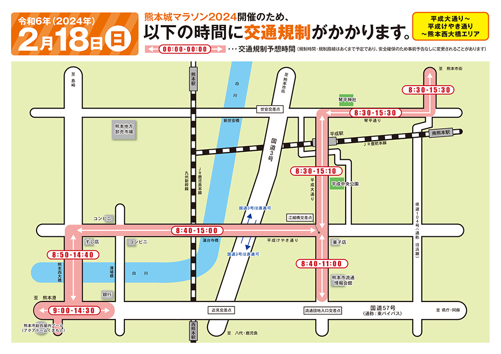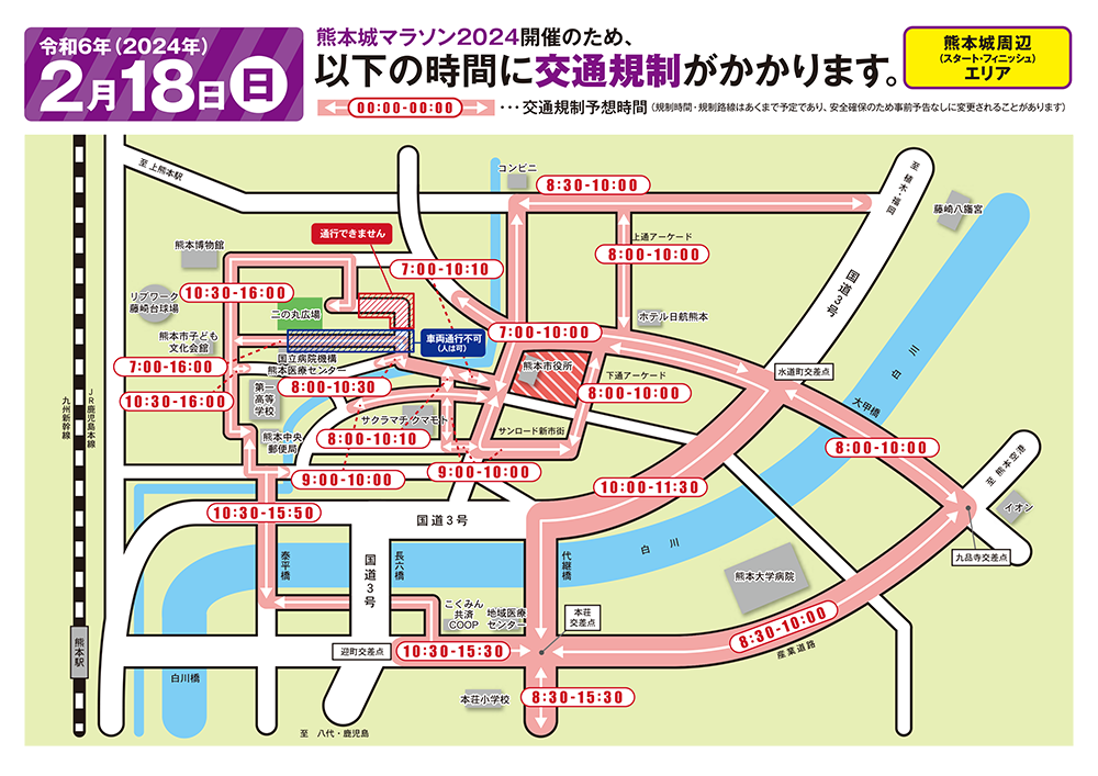 開催日2月18日(日)の熊本市街地エリア交通規制予想時間。