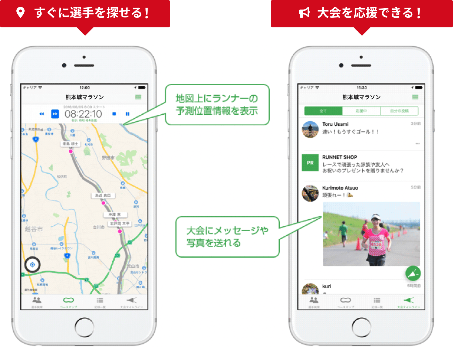 大会当日、スマートフォン・タブレットを利用して、スタートしたランナーの予測位置情報を確認し、コースを先回りして家族や友人を応援するのに便利です。
