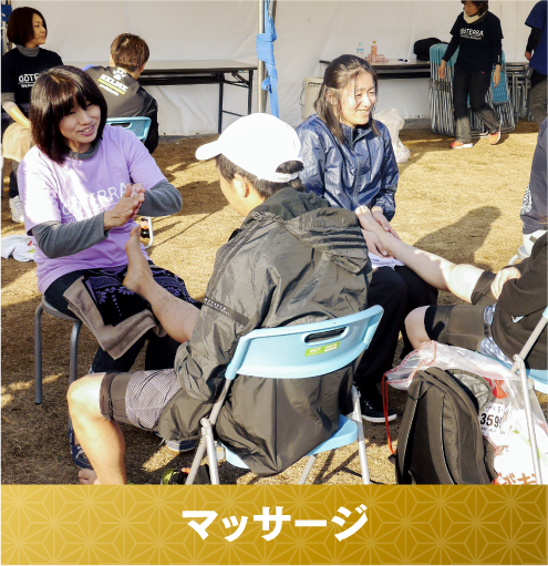 フィニッシュエリアにて、完走したランナーの疲れを癒す植木温泉かけながしの足湯と、マッサージ、アロマをご用意します!