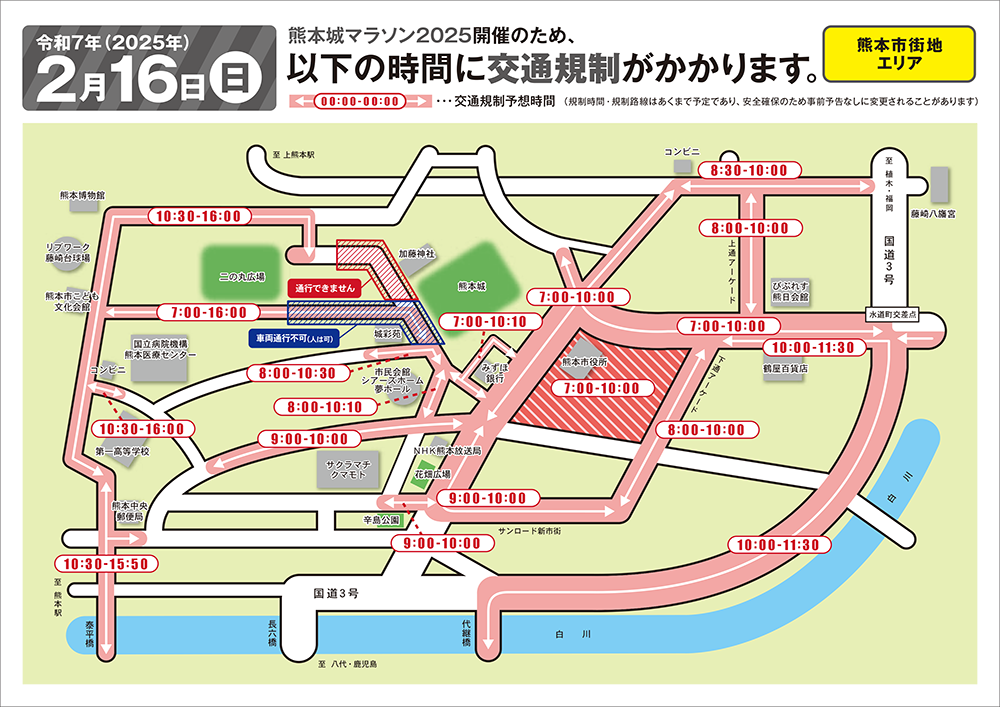開催日2月16日(日)の熊本市街地エリア交通規制予想時間。
