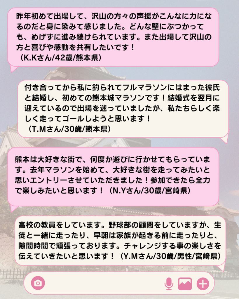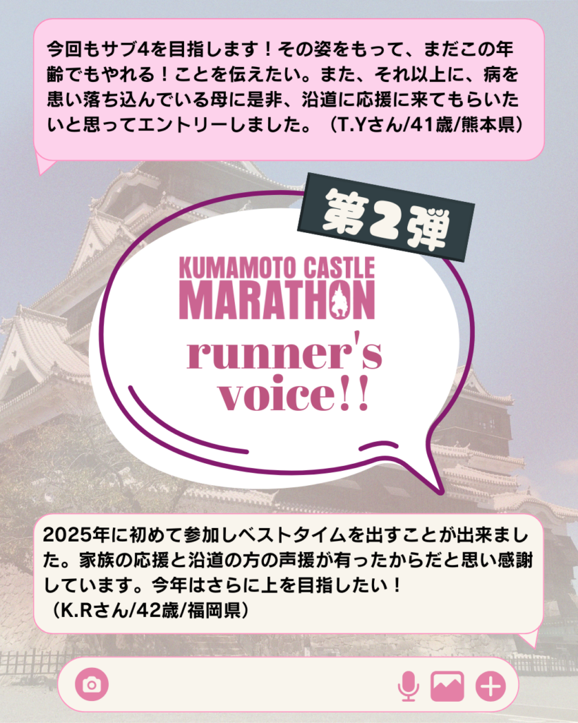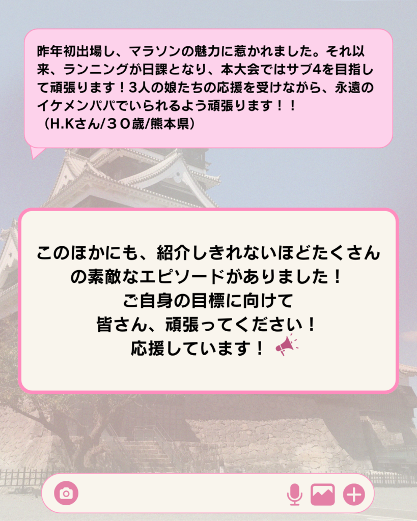 熊本城マラソンには、『初めてフルマラソンに挑戦する方』『自己ベスト更新を目指す方』『長いブランクを経て再び走り始めた方』など、さまざまな“挑戦”が集まっています。