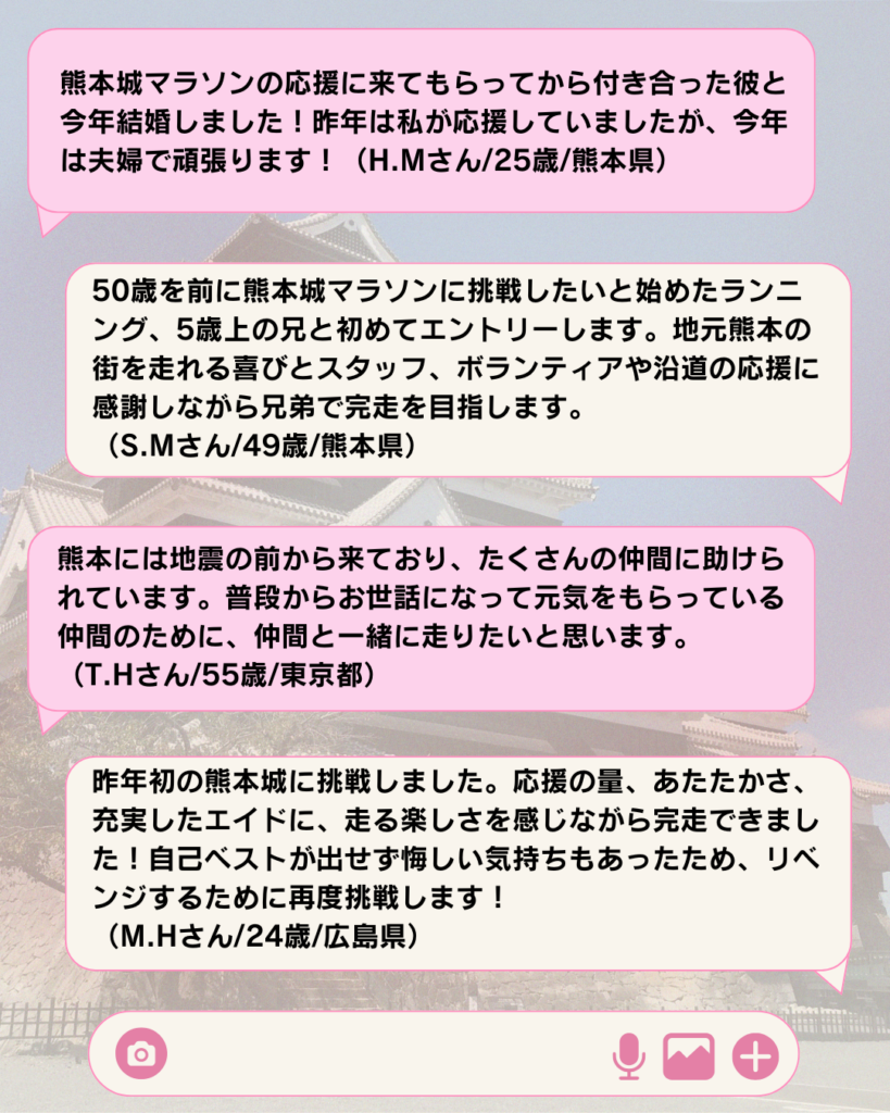 今回ご紹介しているエピソードは、ランナーの皆さまがエントリー時に記入していただいた言葉をそのまま掲載しています。