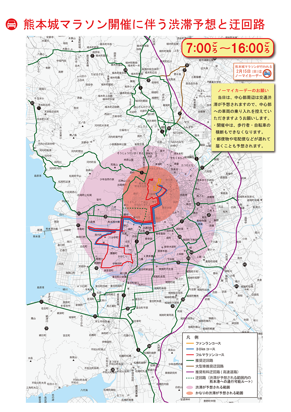 大会当日は、長時間にわたり大規模な交通規制を行いますので、コース沿線以外の通行可能な道路でもかなりの渋滞が予想されます。沿道にお住まいの皆様をはじめ、各店舗、営業所などの関係者の皆様には、大変ご迷惑をおかけいたしますが、熊本城マラソンの開催に、皆様方のご理解とご協力をお願い申し上げます。