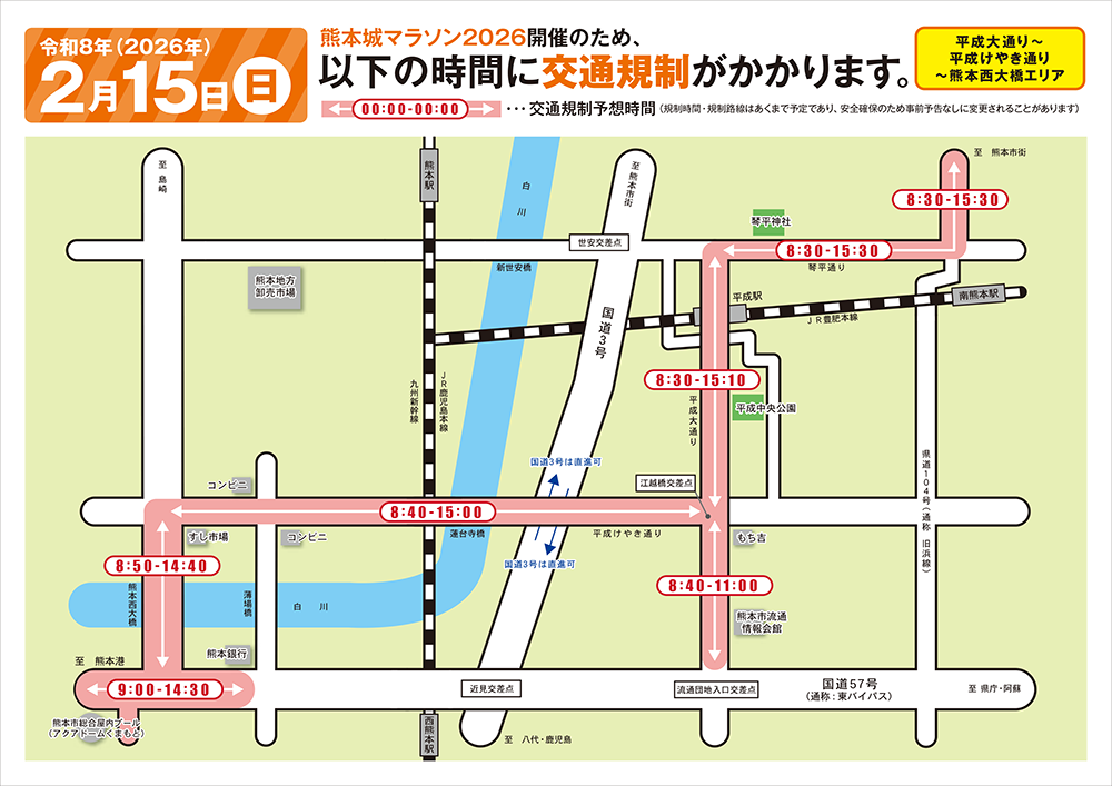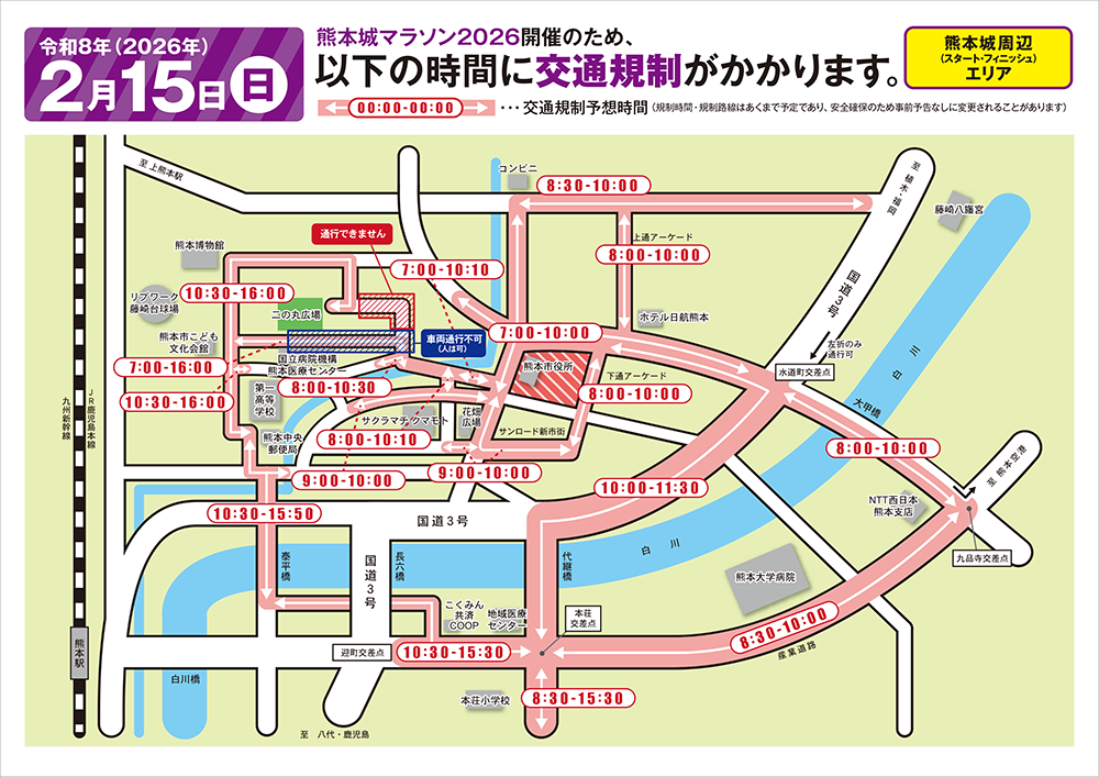 開催日2月15日(日)の熊本市街地エリア交通規制予想時間。